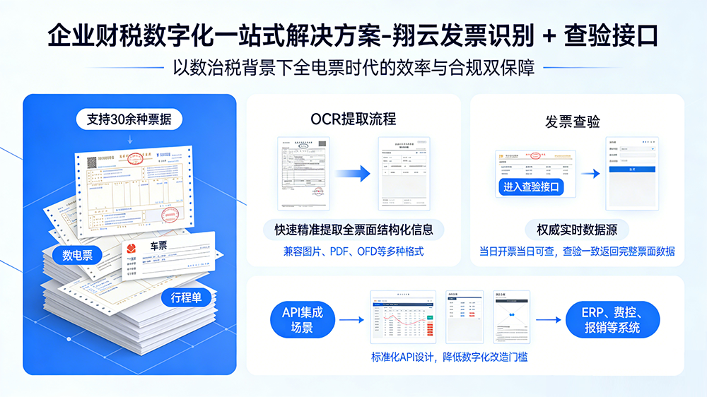 在“以数治税”与数电票全面普及背景下,企业发票管理面临效率与合规双重考验。翔云以发票识别+发票查验双接口组合,提供从票据采集、信息提取到真伪核验的全流程自动化服务,帮助企业降本增效、严控税务风险。